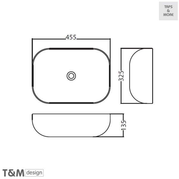 T&M DESIGN Lay-on washbasin without overflow hole Size : 455 x 325 x 135 mm – Level