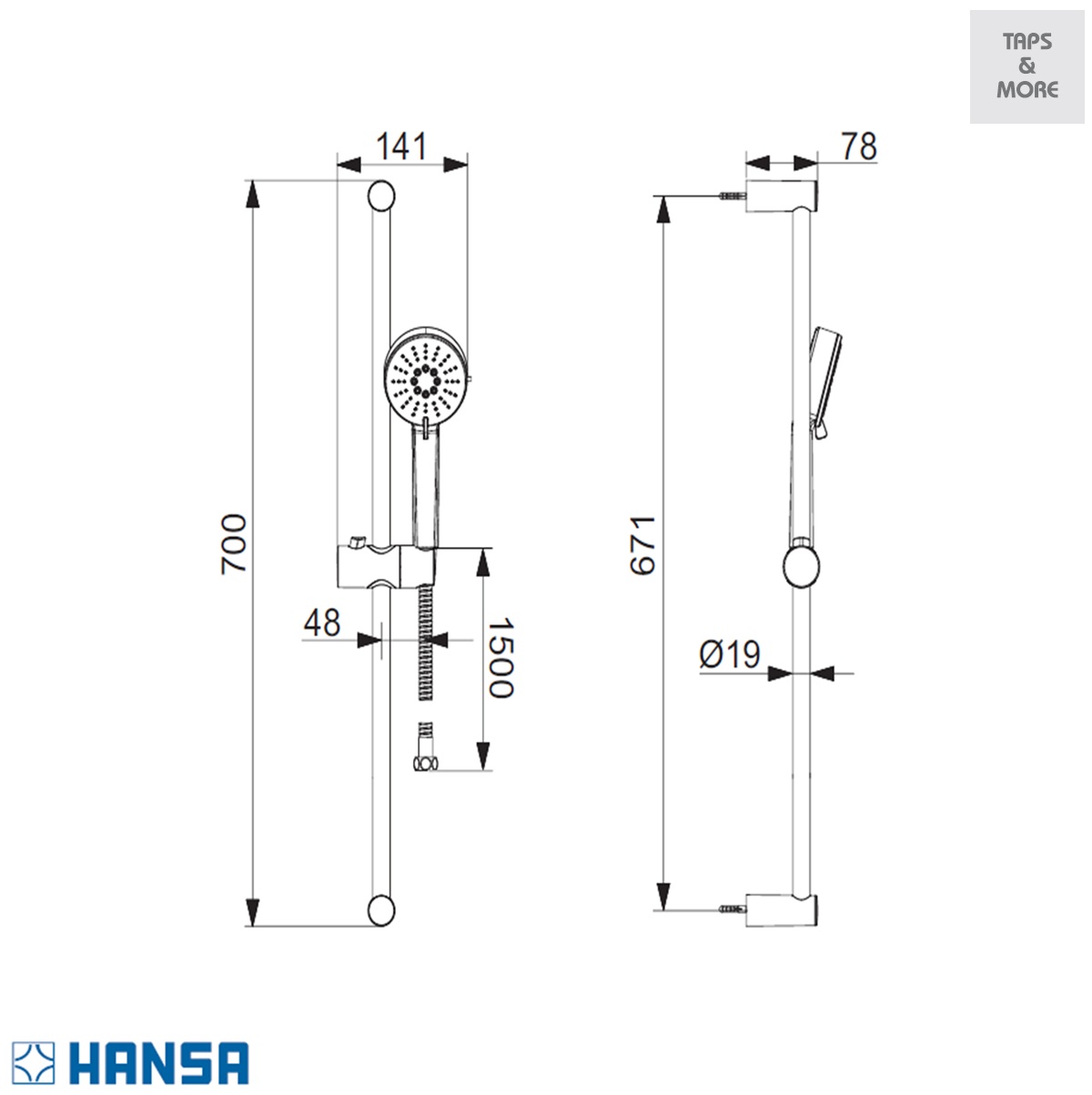 HANSA 3-Speed Shower Rail set without Soap Dish consisting of : shower rail, wall bar 700 mm HANSABASIC 3 hand shower, shower hose 1500 mm – BASIC