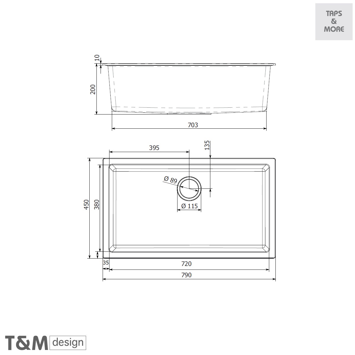T&M DESIGN Inset / Undermount kitchen sink 1 bowl, with waste & overflow fitting, 3 ½” basket strainer