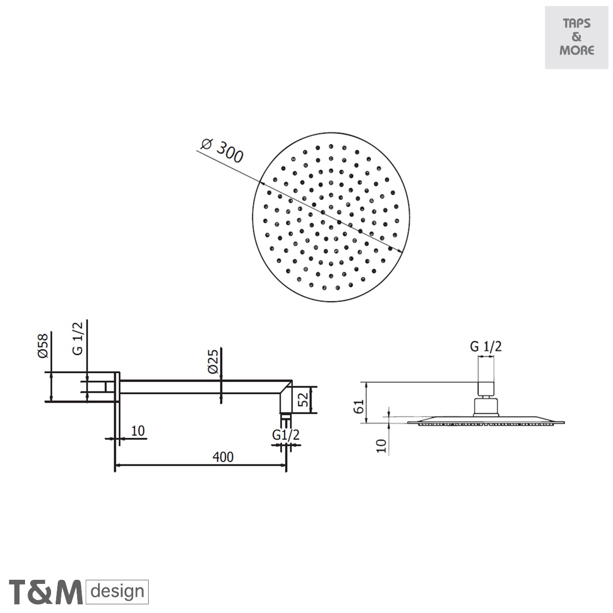 T&M DESIGN Rain Shower Head Ø 300 mm with 400 mm wall mounted shower arm - Art