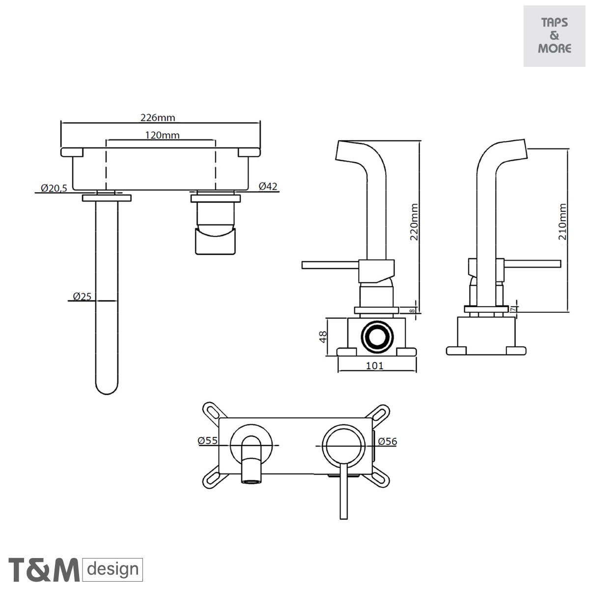 T&M DESIGN Wall mounted washbasin mixer (2 pc.) with concealed body without waste – Vogue